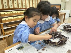 自然の恵みをいかした温かい作品が出来上がりました。これからクラスやエントランスに飾り、園内がクリスマス色に染まっていくのを楽しみたいと思います。