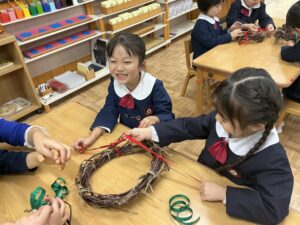 幼稚園で育てたさつまいものつるを使って、子どもたちはクリスマスリース作りを楽しみました。長いつるを三つ編みで編んでいき、丸めていきます。束ねるときにひもで結び、みんなで協力しながら作ることが出来ました。乾燥させたら飾りをつけて完成です。